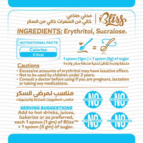 Bliss يمنحك تحلية بطعم رائع حيث 1 جرام (ملعقة واحدة) منه يعادل حلاوة 5 جرام من السكر الأبيض العادي و لا يحتوي على أسبرتام، أو ساكارين أو مواد حافظة مما يضمن مذاقًا نقيًا وطبيعيًا