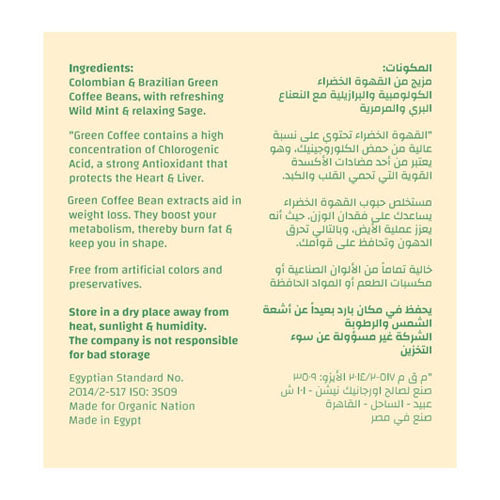 القهوة الخضراء هي مزيج من القهوة الخضراء مع النعناع البري والميرمية التي تساعد في التحكم في وزنك والتخلص من الوزن الزائد للوصول إلى الوزن المرغوب فيه من خلال مزيج من الأعشاب الصحية التي تساعدك على التخلص من الوزن الزائد وكبح الشهية والتحكم في مستويات السكر وخفض مستويات الكوليسترول في الدم. كما أنه غني بمضادات الأكسدة لحماية الجسم من الجذور والحفاظ على صحته.