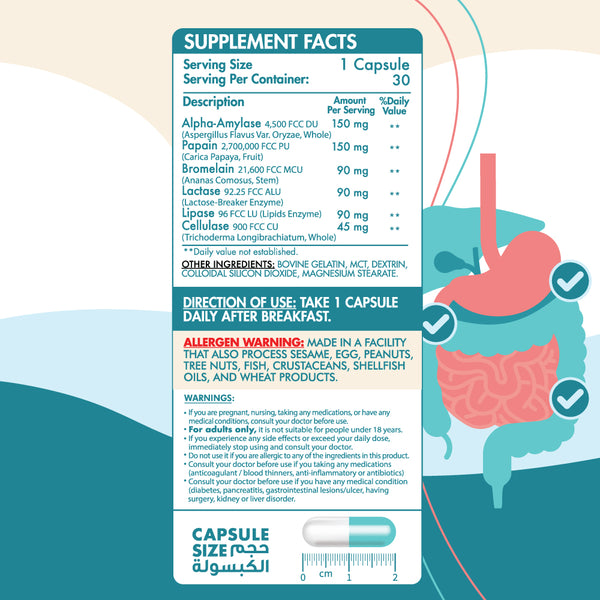 ● الليباز: يعمل على تكسير الدهون، مما يقلل من الانتفاخ والانزعاج بعد الوجبات، وهو مفيد بشكل خاص لمن يعانون من حالات مثل القولون العصبي.