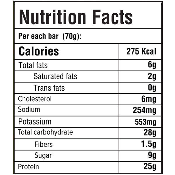 مع زيت جوز الهند وطبقة من الشوكولاتة اللذيذة، فهو ملئ بـ٢٤ جرام من البروتين (بروتين مصل اللبن المركز - بروتين مصل اللبن المعزول - بروتين اللبن المركز)، و٢٨ جرام من الكربوهيدرات، بالإضافة إلى ٢٧١ سعر حراري.