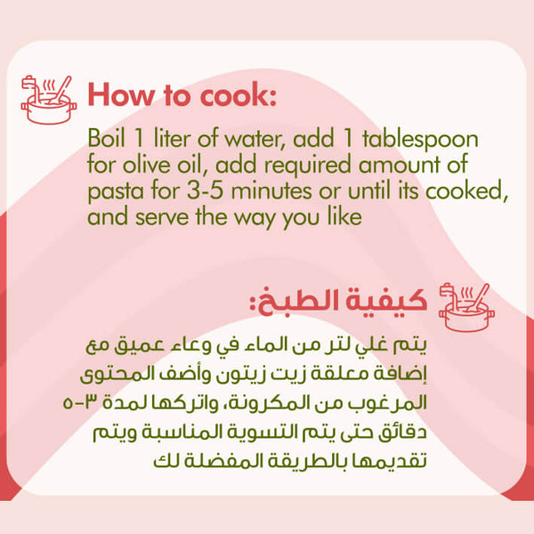 Boil 1 liter of water, add 1 tablespoon for olive oil, add required amount of pasta for 3-5 minutes or until it’s cooked, and serve the way you like.