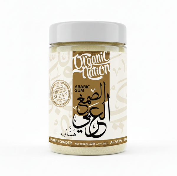 Arabic gum from Organic Nation is Sudanese Hashab, a natural substance produced from Acacia trees. It is a rich source of dietary fiber and is used in various applications, including food, beverages, and medicine.
